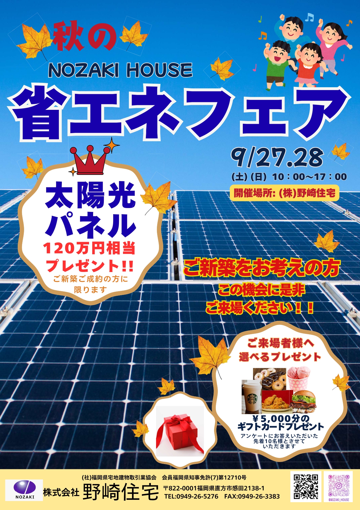 期間中に野崎住宅でご新築いただいたお客様には、《太陽光パネル(120万円相当)》をプレゼントいたします。