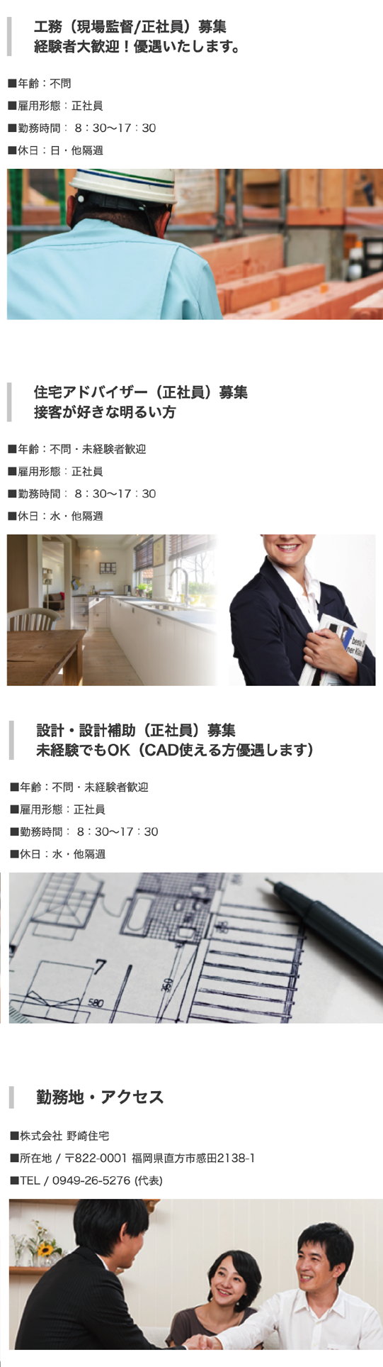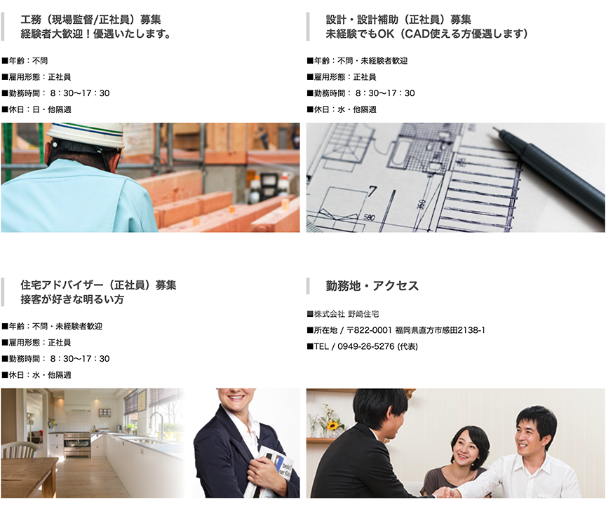 土地探し、ローン、間取りや素材のご提案などお客様に喜んでいただける家づくりのサポート役を担って頂きます。 いかにお客様に感動していただいて、当社に、そして我が家に愛着を持って頂けるのかが野崎住宅のモットーです。お気軽にお電話にてお問い合わせください。