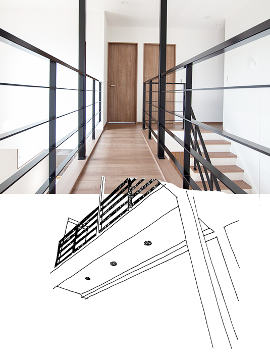 ストリップ階段を上がると子供部屋と寝室をつなぐ天空回廊が。一階リビングが見下ろせる、窓のある吹き抜け空間は大変明るく、開放感に包まれています。
